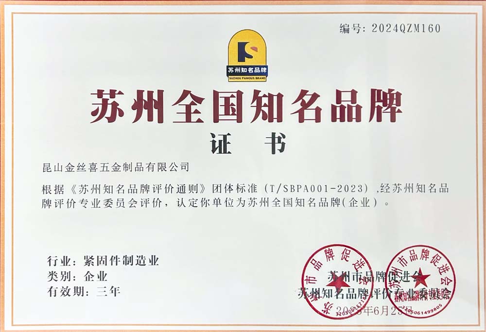KunshanJinsixiMetalware Co., Ltd. er officielt tildelt titlen "National Famous Brand in Suzhou" for sin fremragende produktkvalitet, førende teknologisk styrke, omfattende servicesystem og omfattende markedsindflydelse!