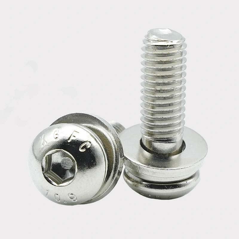 Slovenski Jinsixi-nikkelbelagt hex-stikknapknappekombinationsskrue er en skruesamling med et permanent fastgjort skive eller skive. Kombinationsskruer produceres ved at montere skiven på skruen tomt, før du ruller trådene på skruen. Da den ydre diameter af trådene er større end den indre diameter af skiven, forhindrer dette skiven i at løsne fra bolten. Vaskemaskinen kan normalt glides over den utrømte del af bolten.